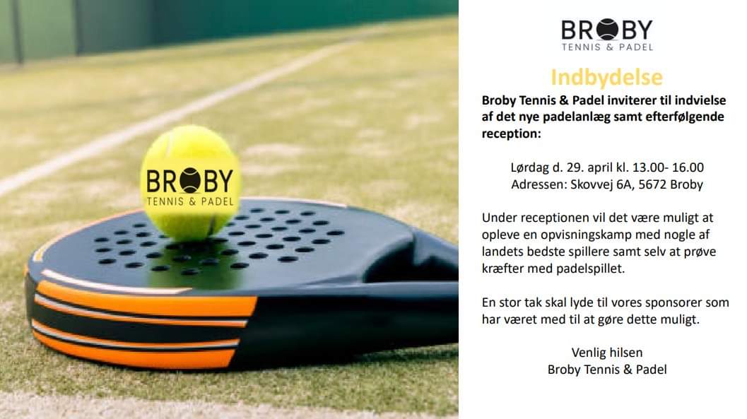 13:00 - 16:00 BROBY TENNIS OG PADEL 29. april 2023 @ 13:00 - 16:00 BROBY TENNIS OG PADEL Lørdag, den 29. april kl. 13.00-16.00 er der indvielse af de nye padelbaner i Brobyværk. Se indbydelse herunder.